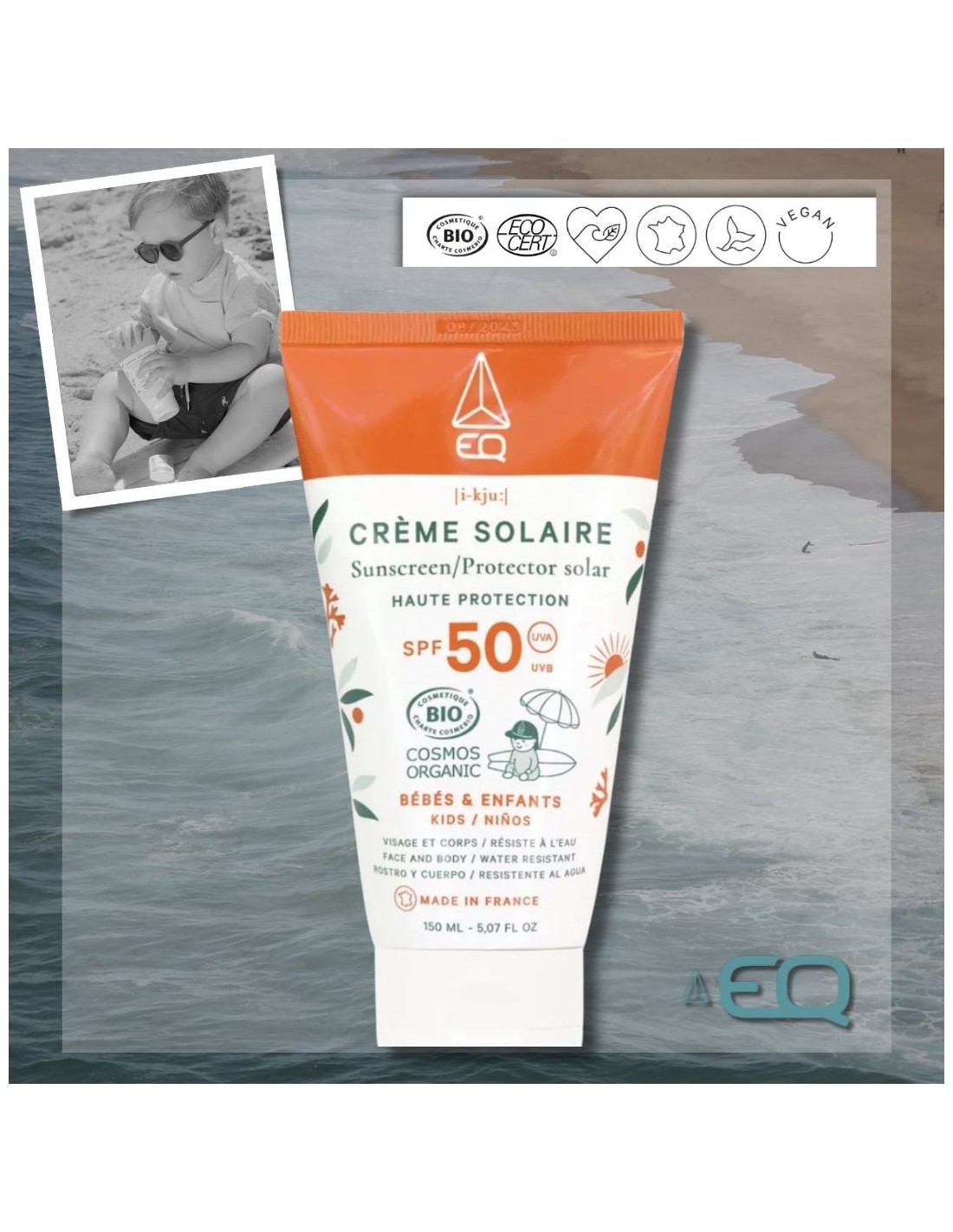 La Crème Solaire Bébés et Enfants SPF50 150ml EQ assure une très haute protection solaire UVA/UVB, certifiée Bio Cosmos par Ecocert. Conçue spécialement pour les peaux sensibles des bébés et des enfants, elle protège leur peau dès l'âge de 3 mois pour assurer la meilleure des protections.